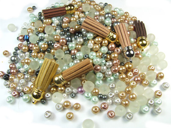 Großes Konvolut mit Glaswachsperlen in sanften Farben, Quasten in Wildlederoptik und satinierten Glasperlen.