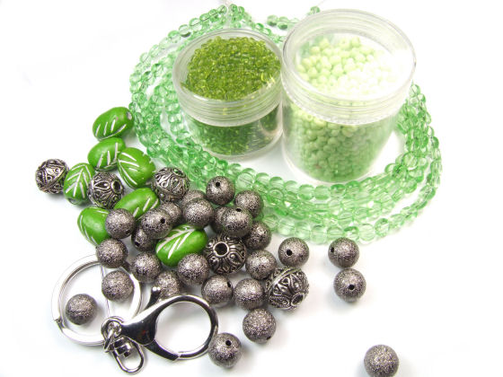 Tolles Konvolut mit 2 verschiedenen Rocailles im Döschen, entzückenden kleinen Glastalern am Strang, Tonperlen und gebürsteten Metallperlen. Dazu ein Schlüsselanhänger.